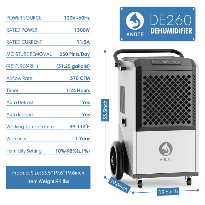 With 370 CFM airflow performance, continuous drainage capability, and rugged industrial construction, the ANDTE DE260N provides a dependable solution for professional humidity control in large spaces.
