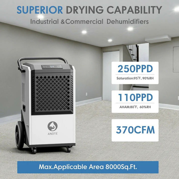 The ANDTE DE260N 250-Pint Commercial Dehumidifier delivers powerful moisture removal for large residential, commercial, and industrial environments. Designed for spaces up to 8,000 sq. ft., it removes up to 250 pints of moisture per day under saturated conditions and 110 pints per day at AHAM conditions, making it ideal for basements, warehouses, factories, offices, and flood restoration projects.