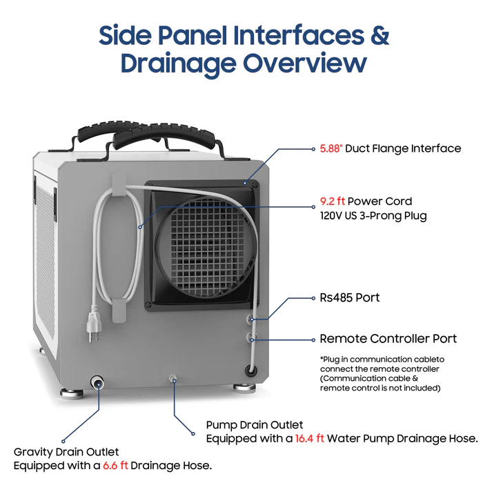 Its ETL-listed metal casing ensures durability and longevity in rugged environments. The unit is designed for continuous operation with a built-in condensate pump and drain hose, allowing water to be pumped up to 16.5 feet or drained via gravity — no need for frequent manual emptying.
