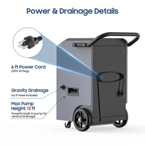 Equipped with three drainage options including built-in pump drainage, continuous mode operation, adjustable humidity control, and a 24-hour timer, this versatile unit provides reliable humidity management across demanding environments.
