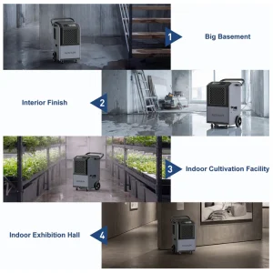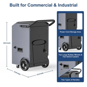Equipped with four transport wheels and a push-pull handle, this commercial-grade dehumidifier is easy to move between rooms, job sites, and working areas with high humidity levels such as basements, warehouses, workshops, factories, storage rooms, and flood repair environments.