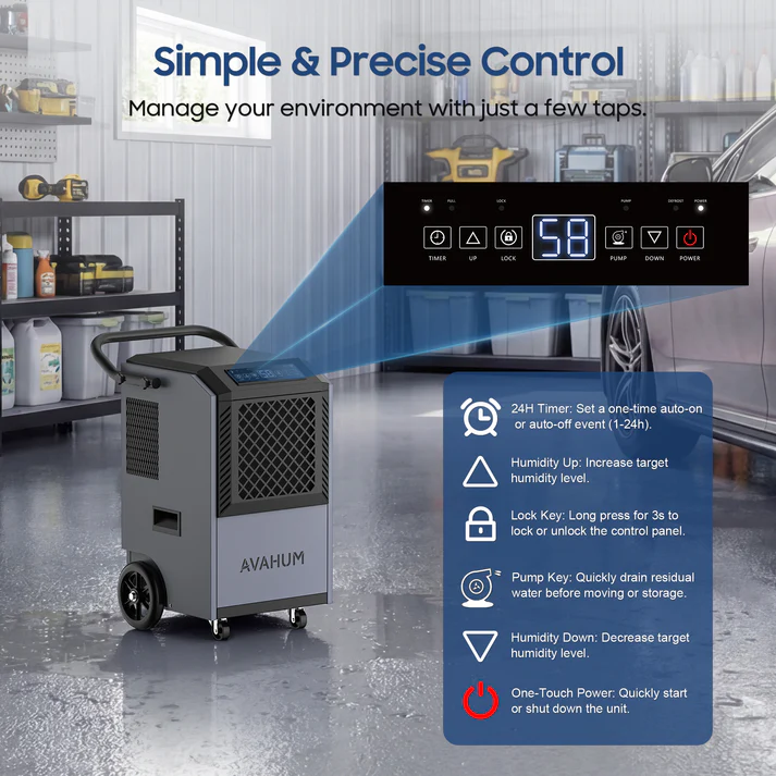 The AVAHUM 160-Pint Commercial Dehumidifier with Pump is designed to provide dependable humidity control across basements, warehouses, factories, workshops, crawlspaces, and restoration environments requiring efficient moisture removal.