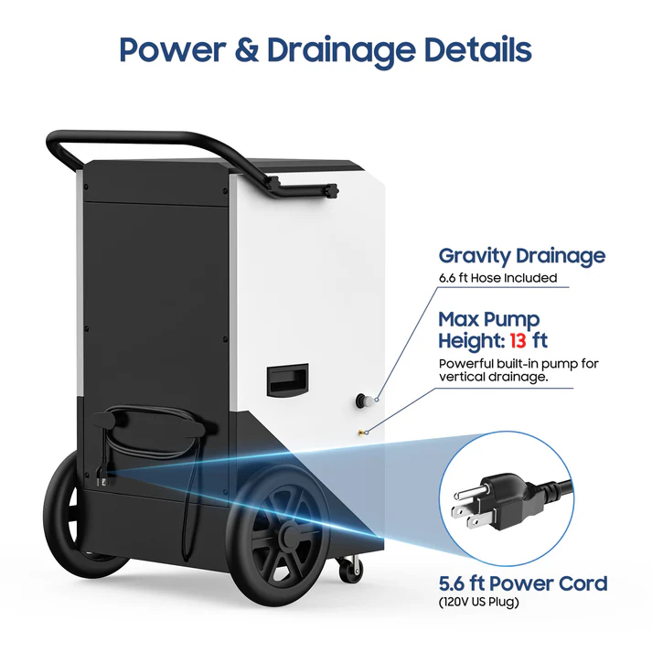 Equipped with a built-in condensate pump, continuous drainage options, auto defrost system, and adjustable humidity control, this industrial-grade unit provides reliable long-term humidity management in demanding environments.