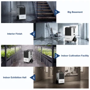 Designed for flexibility across multiple environments—including basements, apartments, storage rooms, offices, factories, restaurants, bars, museums, and flood restoration job sites—the unit supports both everyday humidity control and emergency drying applications.