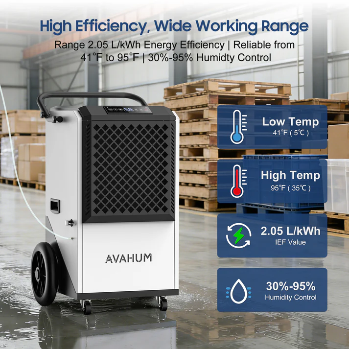 The AVAHUM 250-Pint Commercial Dehumidifier with Pump delivers powerful moisture removal for large residential, commercial, and industrial environments. Designed for areas up to 8,000 sq. ft., it removes up to 250 pints of moisture per day under saturated conditions and 110 pints per day at AHAM conditions, making it ideal for basements, warehouses, garages, restoration projects, and structural drying applications.