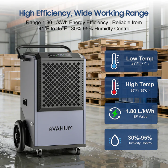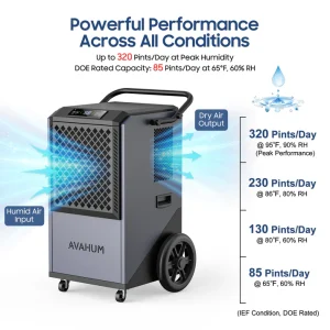 With 417 CFM airflow performance, durable metal construction, and continuous drainage operation, the AVAHUM AM305 provides a dependable solution for large-scale humidity control applications.