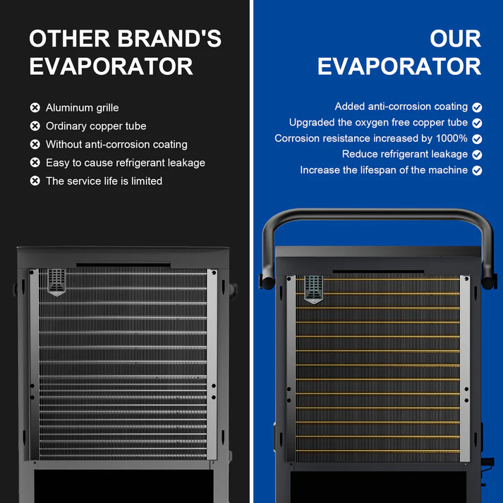 Built with a rugged corrosion-resistant metal housing, semi-pneumatic transport wheels, and reinforced handles, the AVAHUM commercial dehumidifier is designed for safe mobility and long-term durability in demanding industrial environments.