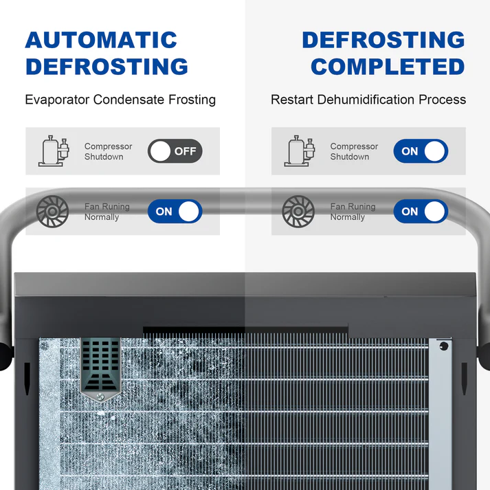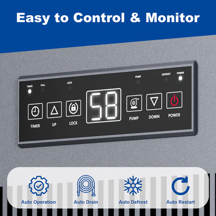 Equipped with a built-in pump, 24-hour timer, continuous drainage operation, and auto defrost system, this industrial-grade unit ensures reliable performance in demanding moisture-control applications.