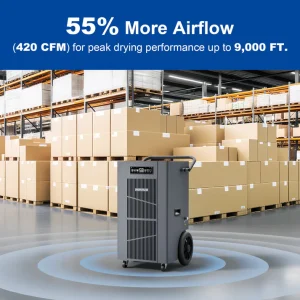 Designed for demanding environments such as basements, warehouses, factories, gyms, museums, laboratories, storage facilities, and flood restoration projects, this unit helps prevent mold growth, condensation buildup, structural moisture damage, and inventory deterioration.