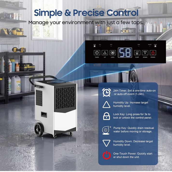 The digital display panel provides real-time humidity monitoring and supports a 24-hour programmable ON/OFF timer, allowing automated scheduling for restoration projects and long-term humidity control applications.