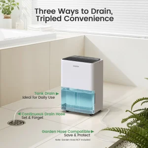 The unit features a 0.39-gallon removable water tank and also supports continuous drainage using the included 3.3-ft drain hose, allowing uninterrupted operation without the need to frequently empty the tank.
